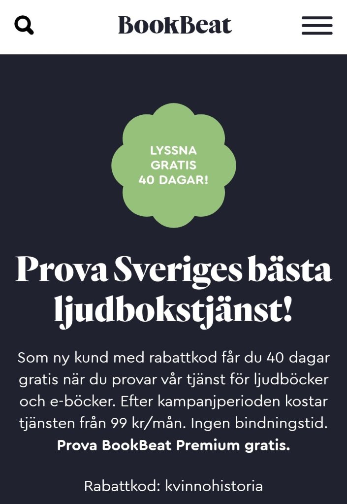 Nu har ni möjlighet att ta del av ett mycket fint erbjudande från BookBeat som du kan få testa gratis i 40 dagar via den här länken + rabattkoden Kvinnohistoria