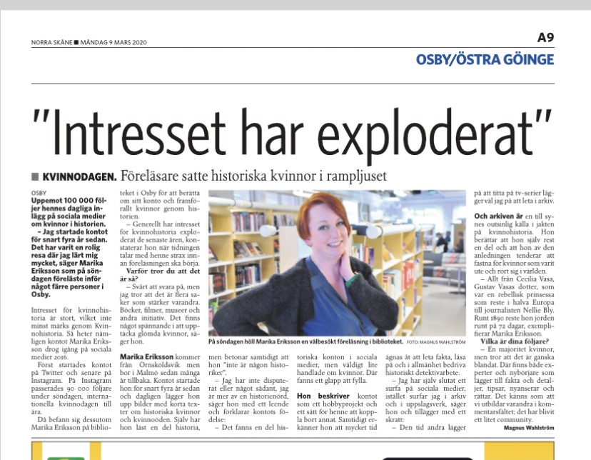 Det roligaste med hela det här arbetet har varit alla reaktioner och den gemenskap som uppstått i de sociala kanalerna. Jag har ofta fått hjälp av följare att fylla på och bredda bilden av de kvinnor jag presenterat. Vi har helt enkelt tillsammans hjälpts åt att skriva kvinnornas historia tillsammans.